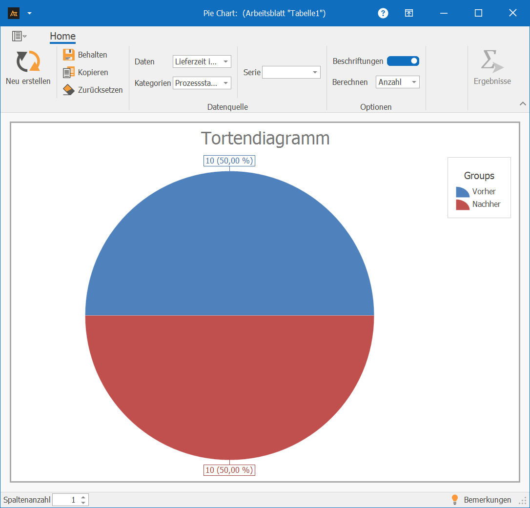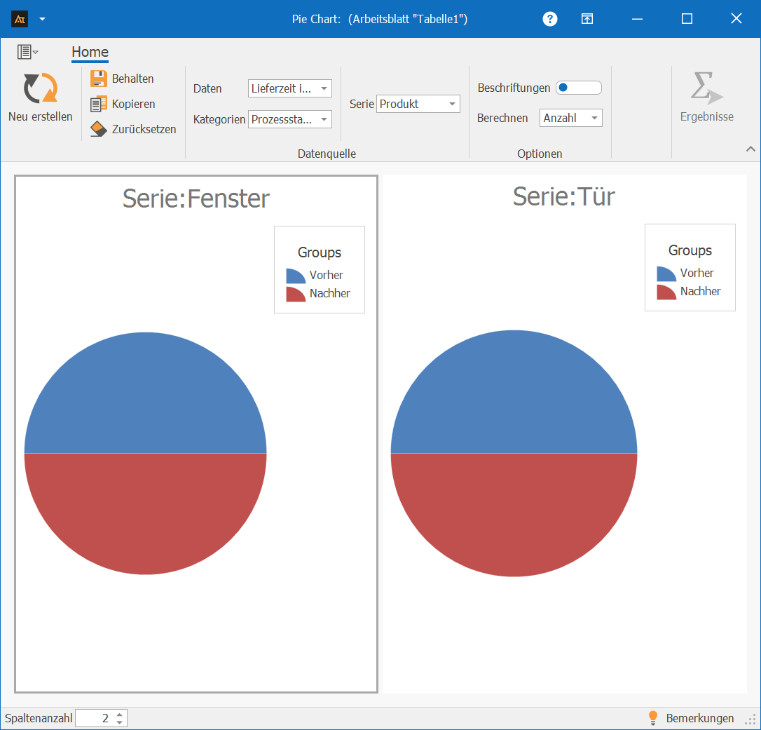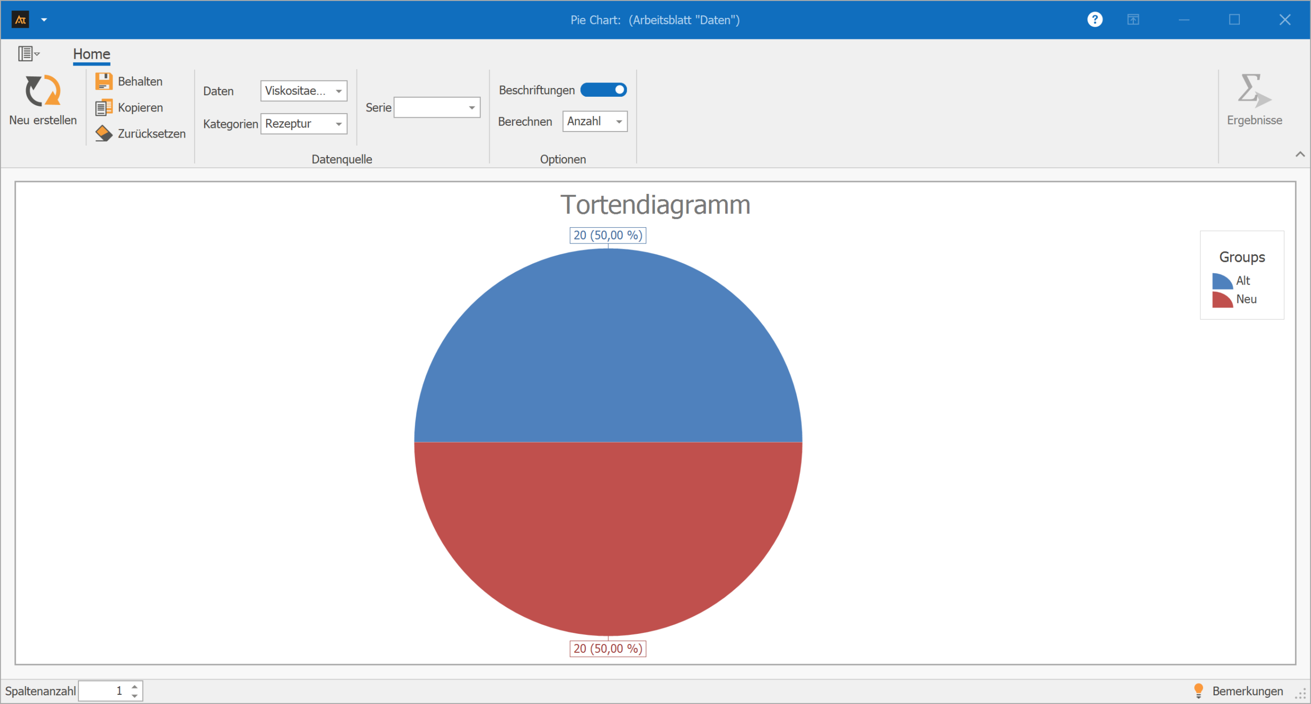Das Tortendiagramm verdeutlicht damit, dass die Datengrundlage für beide Rezepturen gleichmäßig verteilt ist.