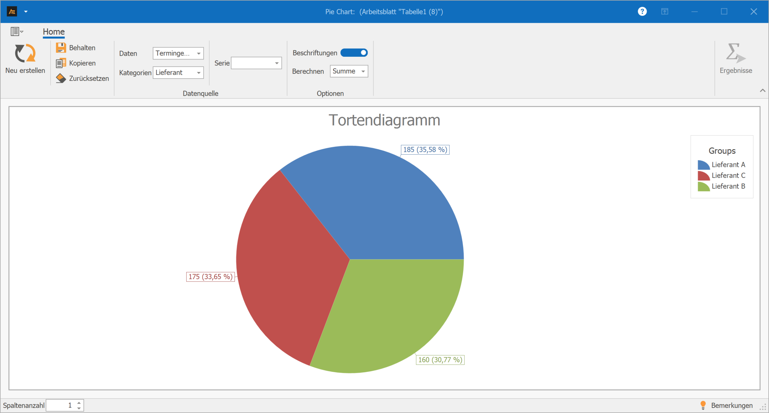 Das Tortendiagramm verdeutlicht damit, wie sich die termingerechten Lieferungen auf die einzelnen Lieferanten verteilen.