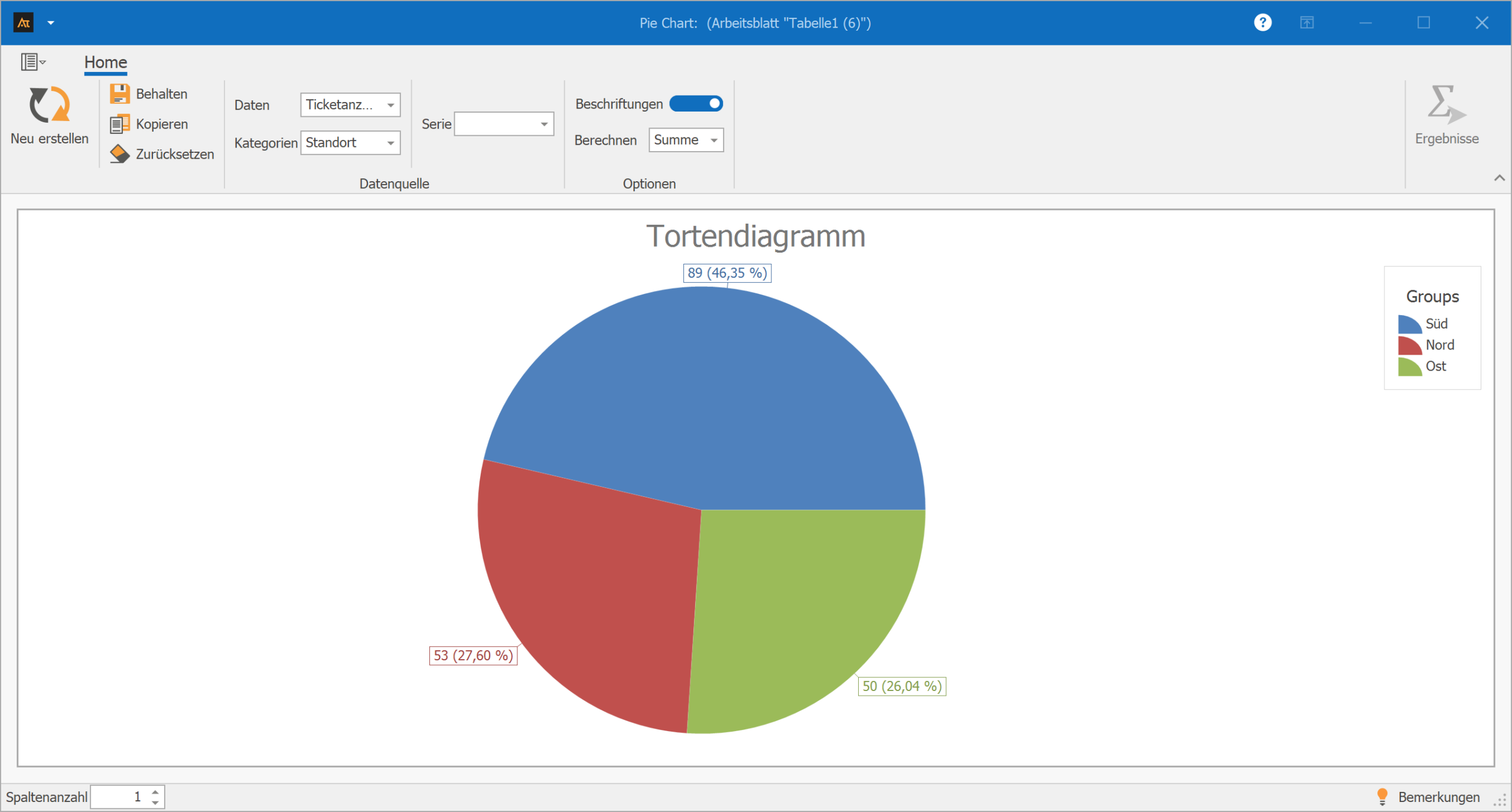 Das Tortendiagramm verdeutlicht damit, wie sich das gesamte Ticketaufkommen auf die einzelnen Standorte verteilt.