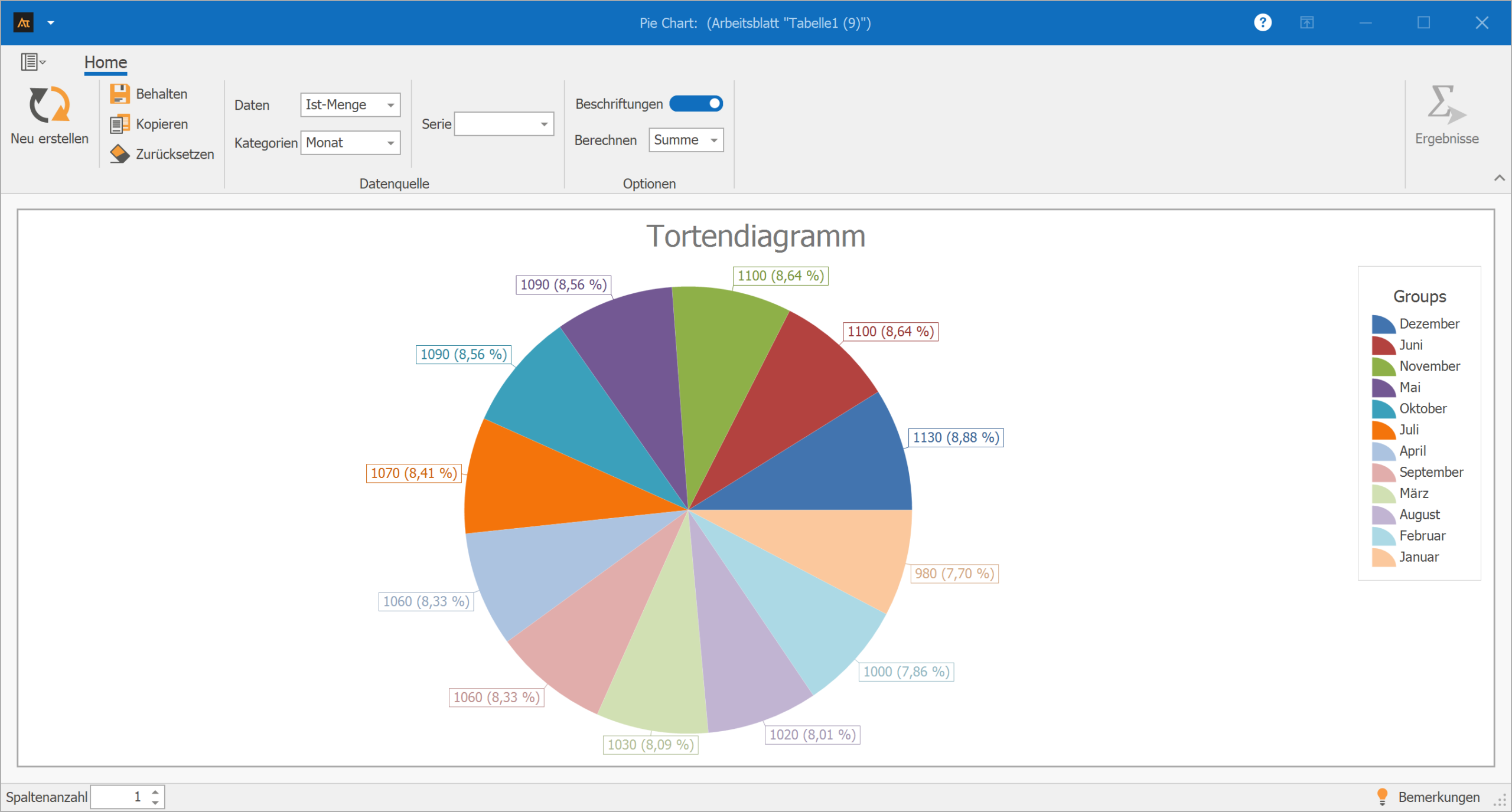 Mithilfe eines Tortendiagramms wird dargestellt, welchen Anteil die einzelnen Monate an der gesamten Jahresproduktion haben.