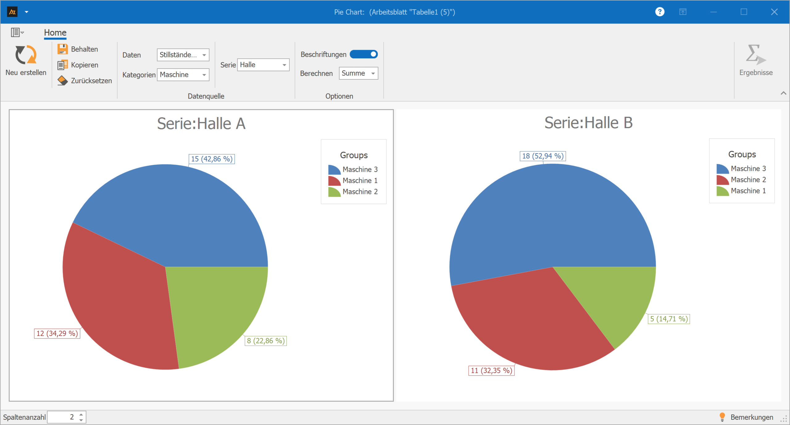 Mithilfe eines Tortendiagramms wird dargestellt, welchen Anteil die einzelnen Maschinen an der Gesamtzahl aller Stillstände haben.