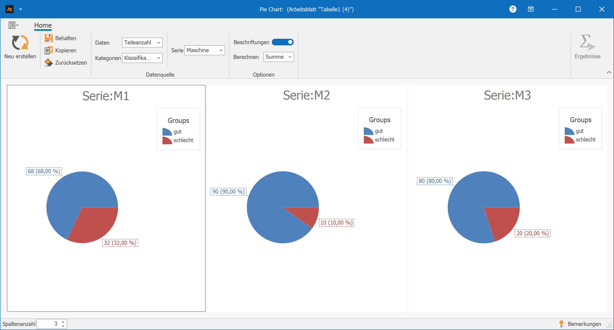 Die Tortendiagramme machen damit sichtbar, wie sich die Prüfergebnisse innerhalb jeder Maschine auf Gut- und Schlechtteile verteilen.