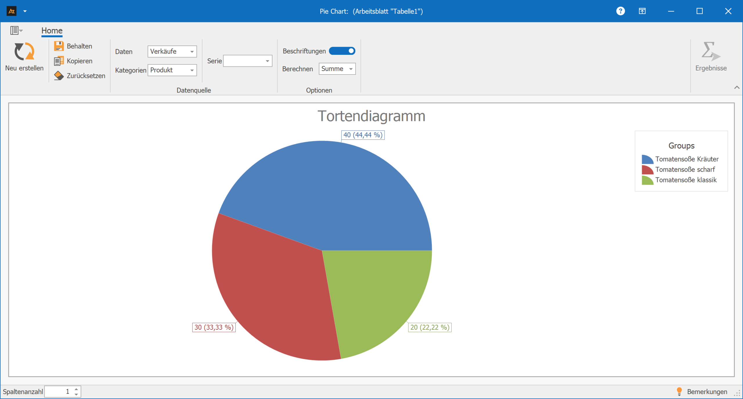 Zur Auswertung wird ein Tortendiagramm verwendet, das darstellt, welchen Anteil jede Produktvariante am Gesamtabsatz hat.