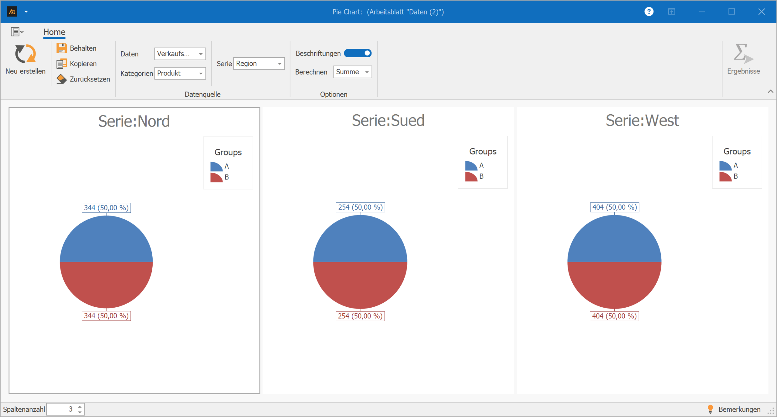 Mithilfe eines Tortendiagramms wird für jede Region dargestellt, wie sich die Verkaufsabschlüsse auf die Produkte A und B verteilen.