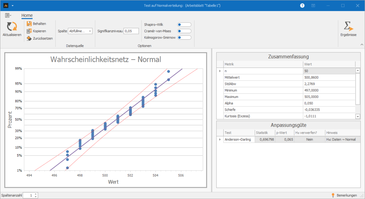 Der Test auf Normalverteilung dient dazu zu prüfen, ob die vorliegenden Daten ausreichend gut durch eine Normalverteilung beschrieben werden können. Viele statistische Methoden, wie zum Beispiel die Prozessfähigkeitsanalyse mit Cp und Cpk, setzen normalverteilte Daten voraus. Der Test liefert Hinweise darauf, ob diese Voraussetzung erfüllt ist und ob weitere Analysen auf dieser Basis durchgeführt werden können. Hierzu betrachtet man den p-Wert: Ist der p-Wert größer als 0,05, werden die Daten als annähernd normalverteilt behandelt.