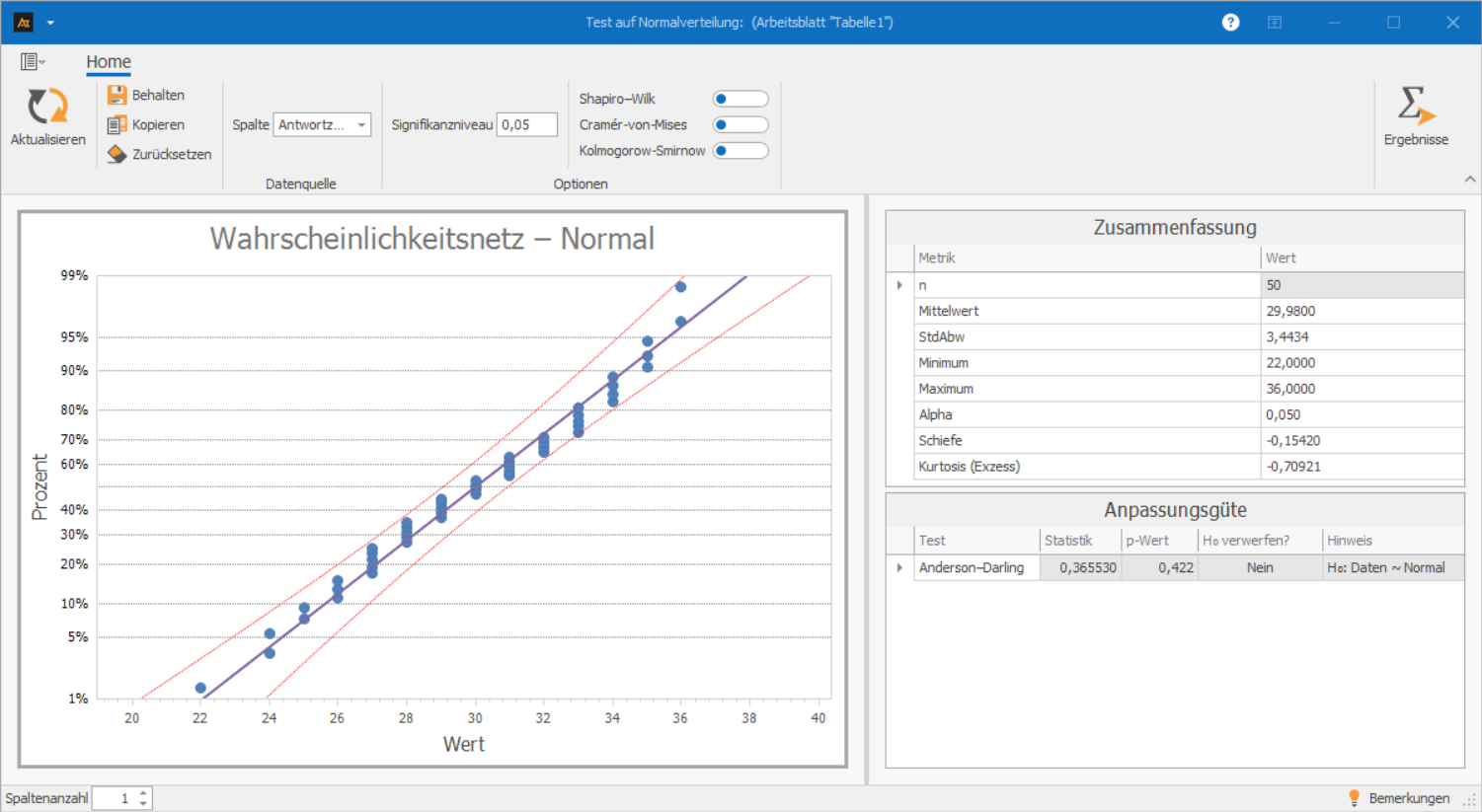 Der Anderson-Darling-Test bestätigt diesen Eindruck: Der p-Wert beträgt 0,422 und liegt damit deutlich über 0,05. Es gibt daher keine Hinweise auf eine signifikante Abweichung von der Normalverteilung.