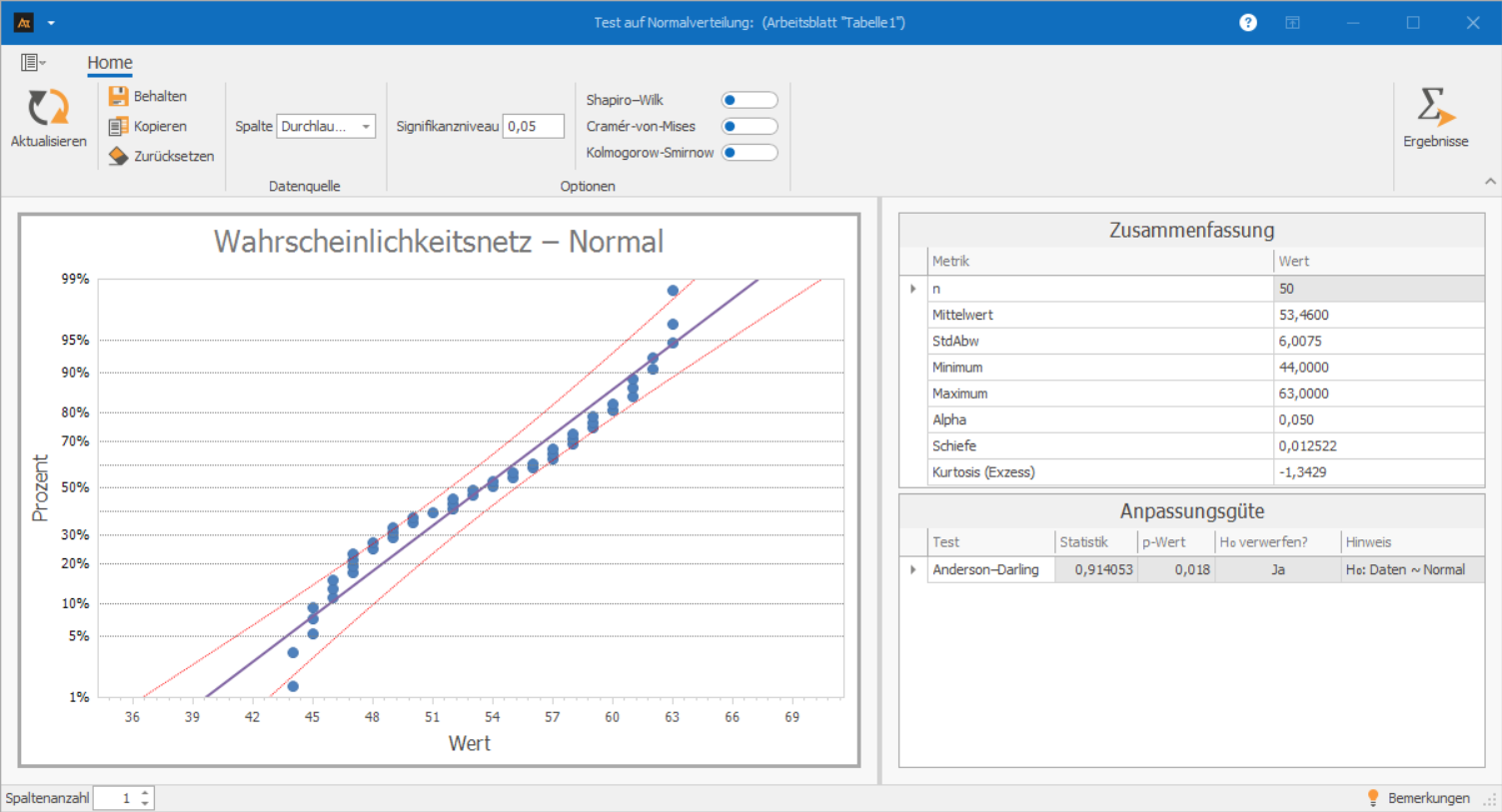 Der Anderson-Darling-Test bestätigt diese visuelle Einschätzung: Der p-Wert beträgt 0,018 und liegt damit unter 0,05. Die Nullhypothese der Normalverteilung wird somit verworfen: Die Daten sind nicht normalverteilt.