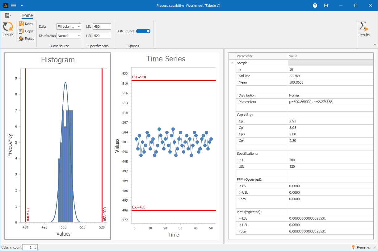 The Cp value of 1.10 shows that the dispersion of the process is still too high – the process is therefore not capable due to dispersion. Since Cpk is also slightly smaller than Cp, there is also a slight positional deviation. However, the main cause of the lack of process capability is clearly the excessive dispersion.