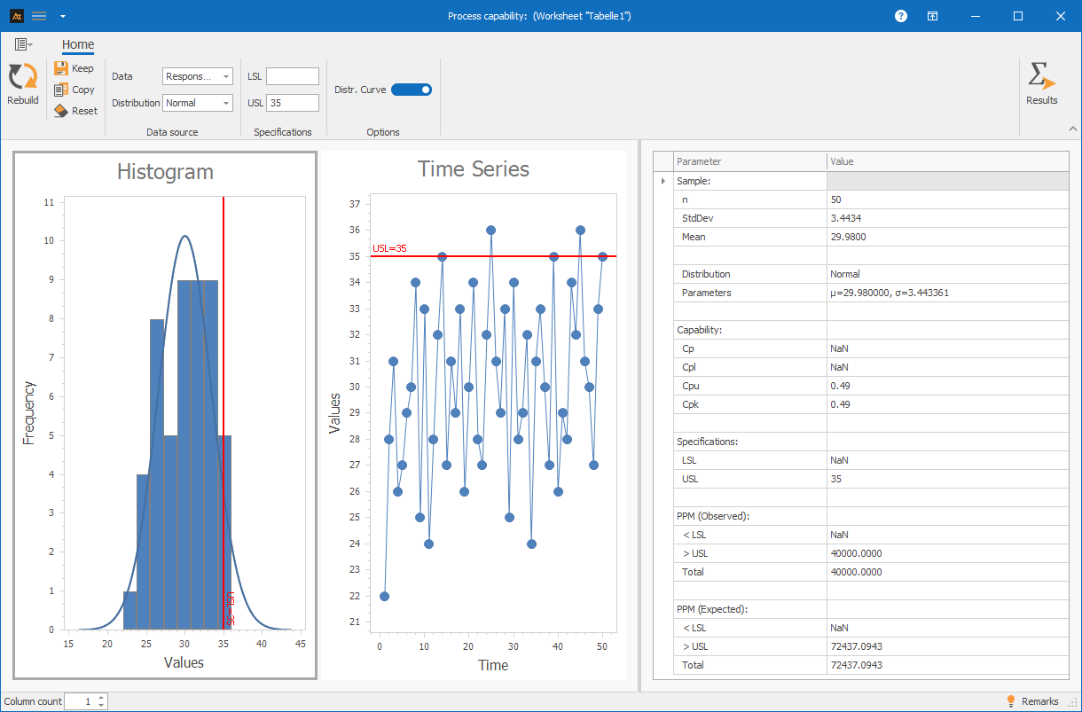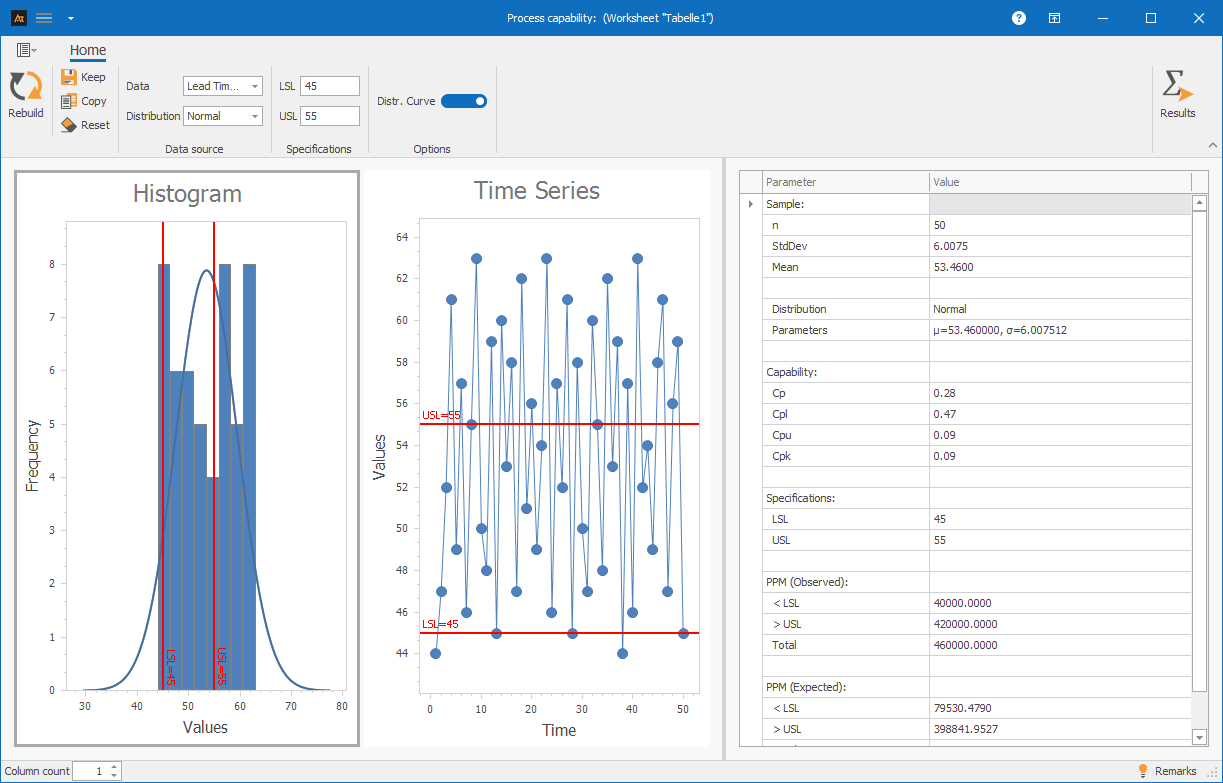 To calculate Cp and Cpk, it is assumed that the data follows a distribution. Different formulas are stored for the various distributions, so the operator must select the appropriate distribution, for example, using the distribution test.