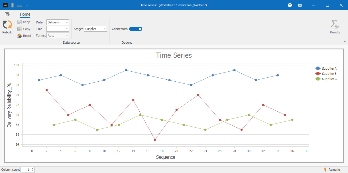 For the time series chart, delivery reliability was calculated for several calendar weeks. Each data point corresponds to a supplier’s delivery reliability for a given week.