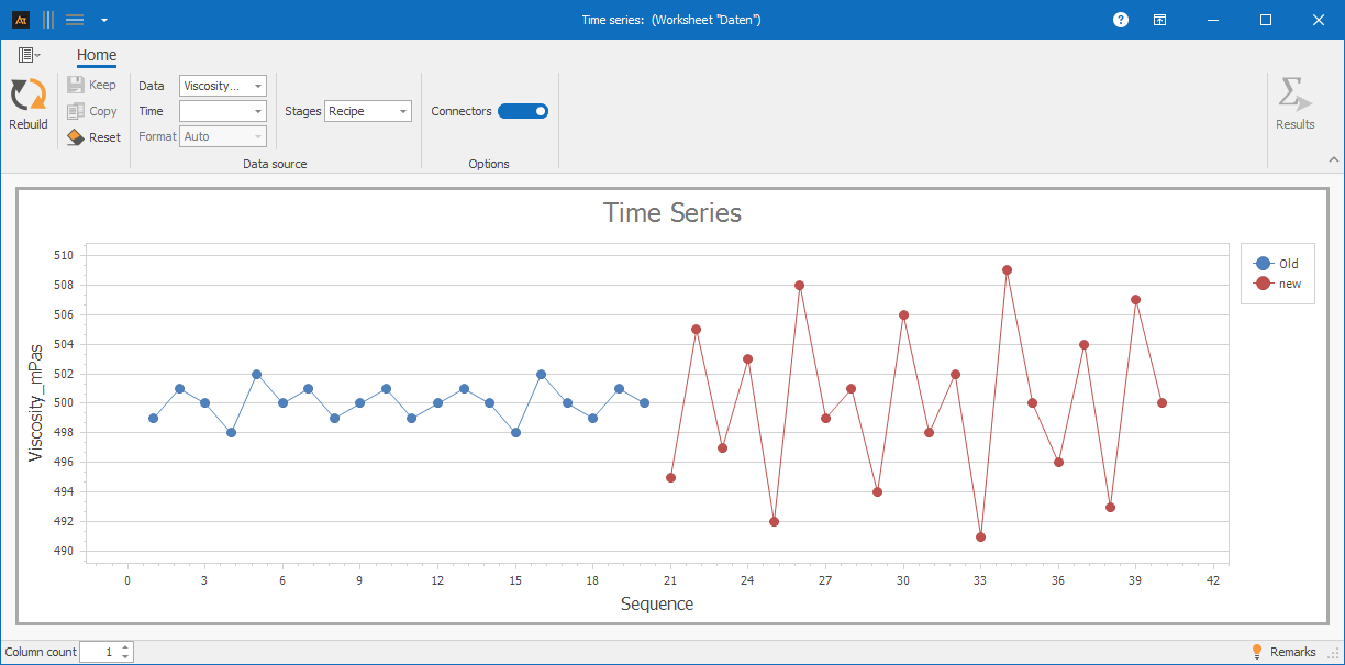 The time-series plot shows a steady trend in viscosity for the old formulation. For the new formulation, a greater variation in the measured values is evident, though the overall trend remains unchanged. No trend or sudden change is visible.