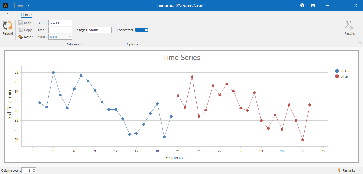 Using a time series chart and the “Before/After” metric, this comparison can be conducted in a structured manner. This allows for a targeted analysis and evaluation of changes in lead times over time.