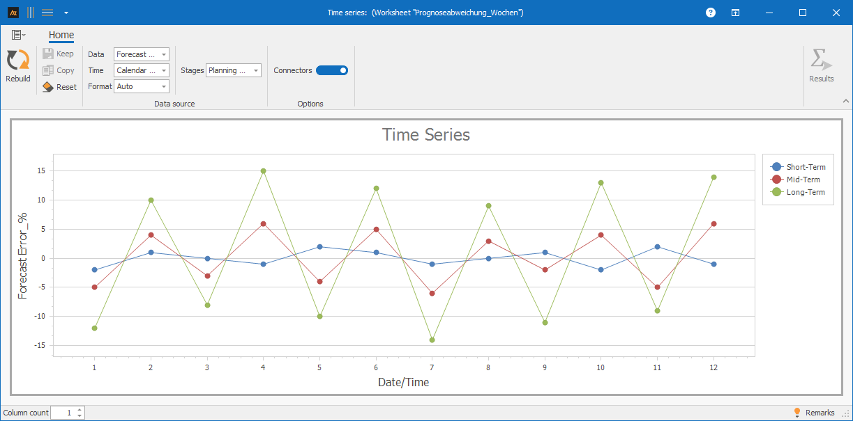 In production planning, demand forecasts are created. A time series chart is used to analyze whether forecast variances differ over time across various planning periods.