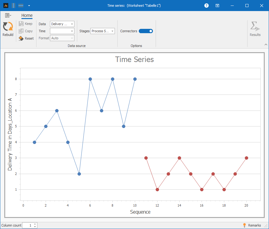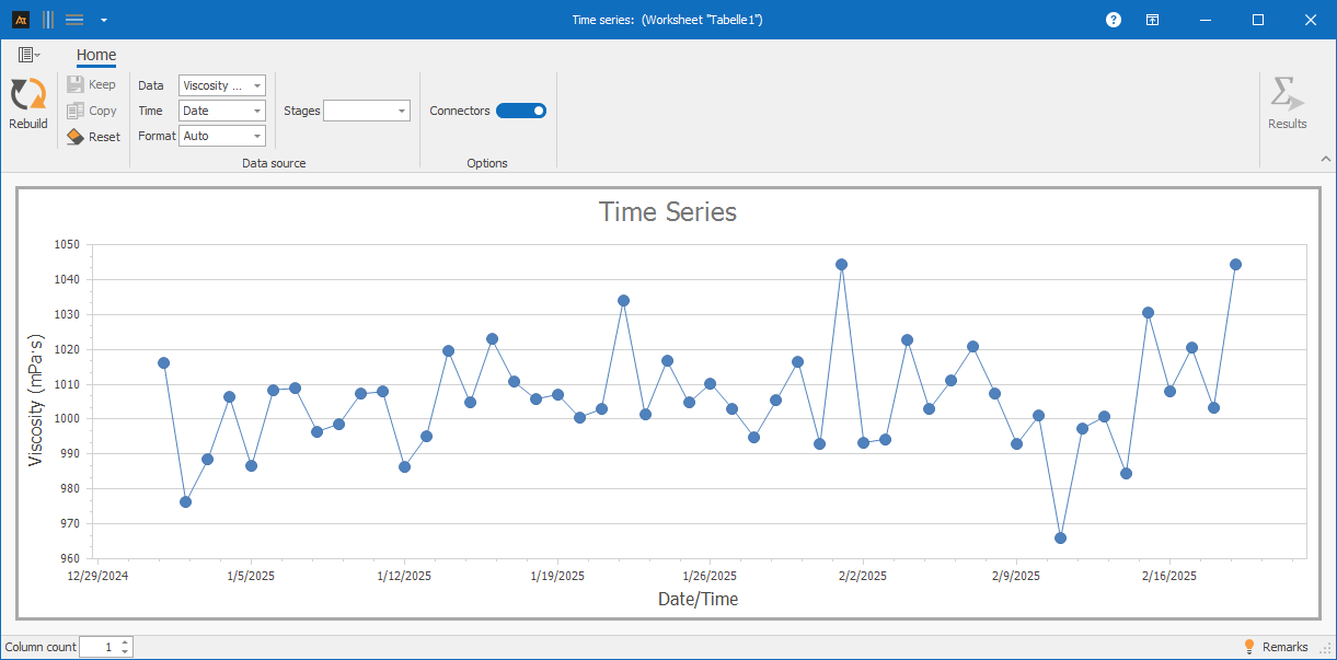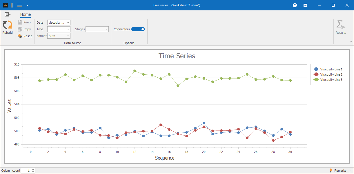 In a time series chart, each data point is displayed in the order in which it was recorded. The x-axis shows the time reference (e.g., measurement number or calendar week), and the y-axis shows the measured variable.
