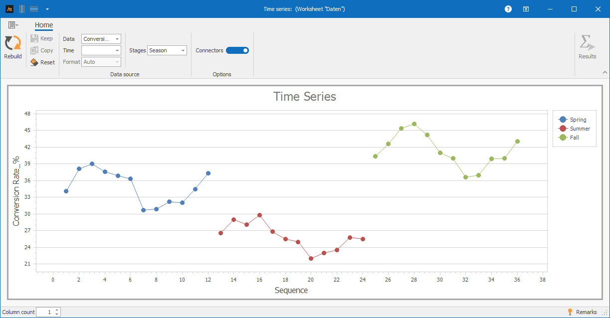 In sales, sales opportunities are analyzed by season. To this end, one data point was recorded per week for each season; additionally, the season was defined as a categorical variable. A time series chart will be used to analyze whether and how the sales rate has changed over time within each season.