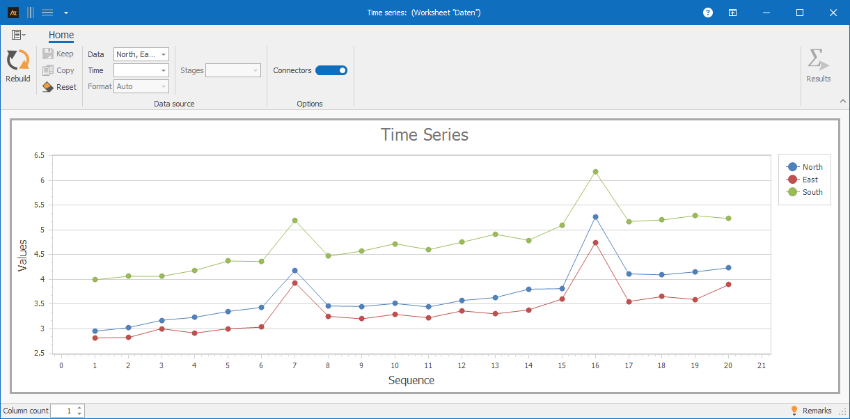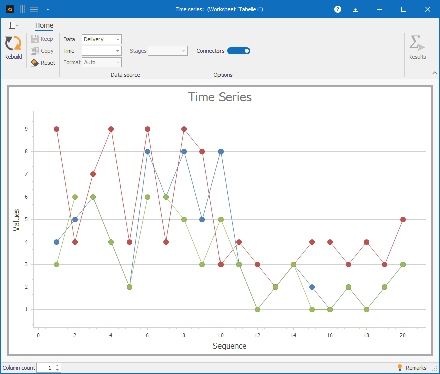 Various display options are available for time series charts. The chart’s appearance changes depending on whether one or more data series, as well as additional groups or series, are selected. Data can thus be visualized as individual time series or broken down into groups, allowing for targeted comparisons. All of the following display formats are based on the same file but differ in the selection of columns used. The procedure for each is described in the individual tiles.